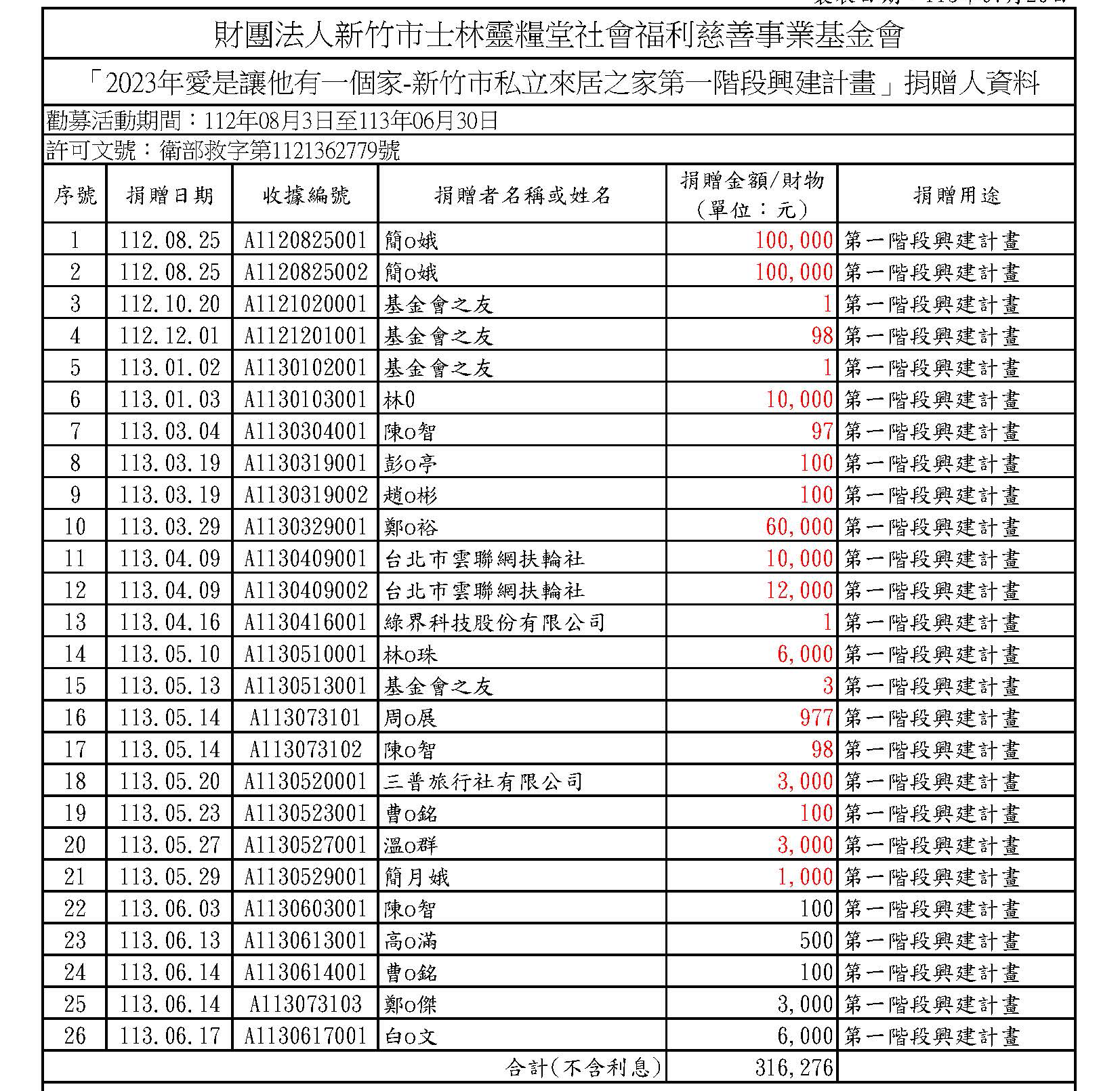 「2023年愛是讓他有一個家-新竹市私立來居之家第一階段興建計畫」捐款芳名錄