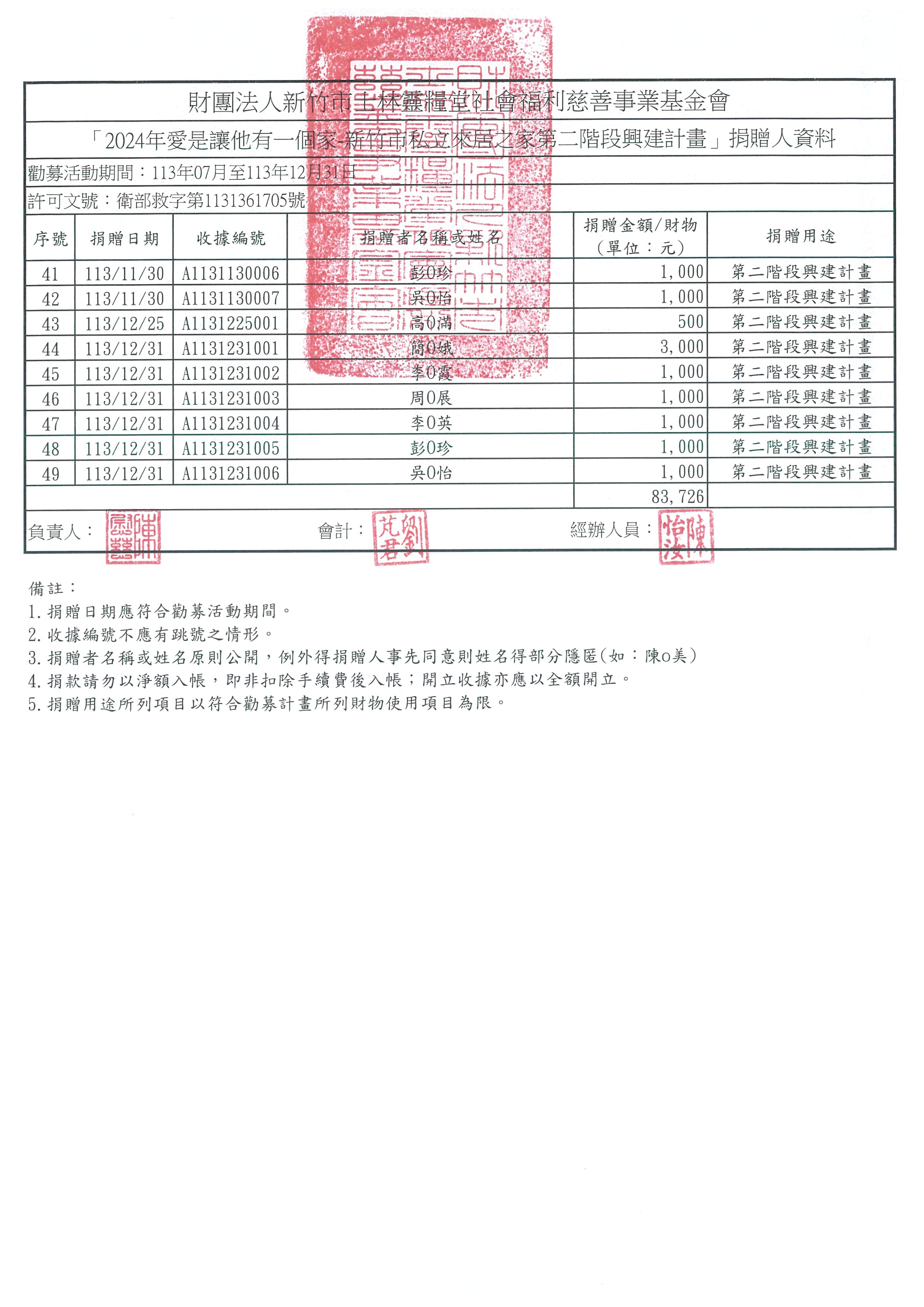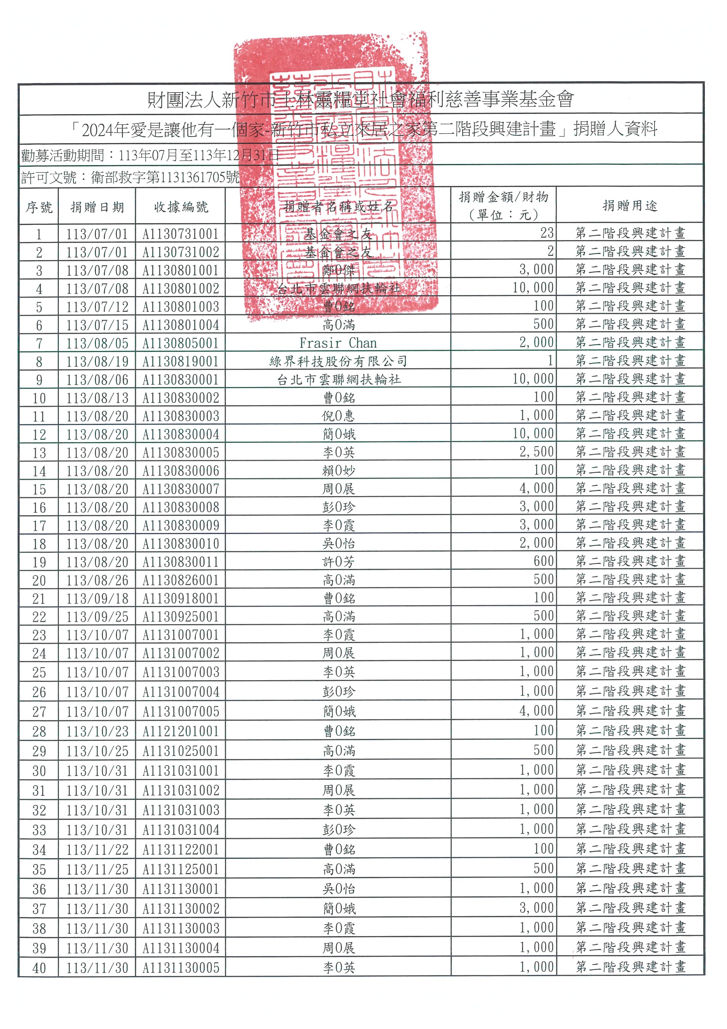 2024年愛是讓他有一個家-新竹市私立來居之家第二階段興建計畫」捐贈芳名錄
